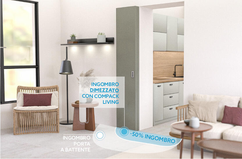 Il sistema COMPACK LIVING® 180° permette di progettare nuove soluzioni di arredo liberando spazi accanto all’apertura porta, grazie alla riduzione dell’ingombro sia in fase di apertura che nell’appoggio a parete.